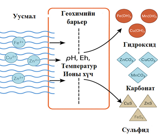 Харьцуулсан судалгаануудын дүнгээр Fe–Mn гидроксид, карбонат, органик коллоид зэрэг фазууд нь хүнд металлын шингээлт, тунадасжилтад голлох үүрэгтэй болохыг харуулсан.